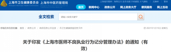 近日,上海市卫健委发布《上海市医师不良执业行为记分管理办法》(以下统称《办法》),自2021年2月15日起实施。