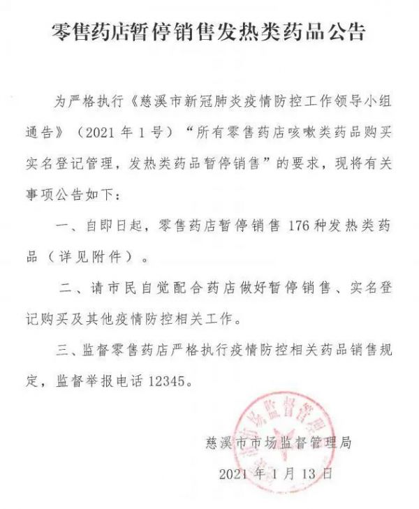 1月14日,余姚市市场监督管理局发布《关于零售药店暂停销售发热类药品的公告》。