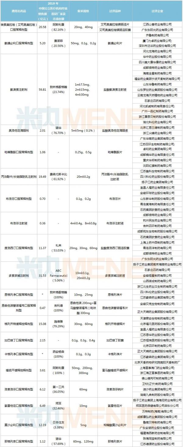 米内网数据显示,45个通用名药品在2019年中国公立医疗机构终端合计销售额550亿元,涉及最高采购规模超过250亿元,高于第三批集采55个品种最高采购额226亿元的体量。