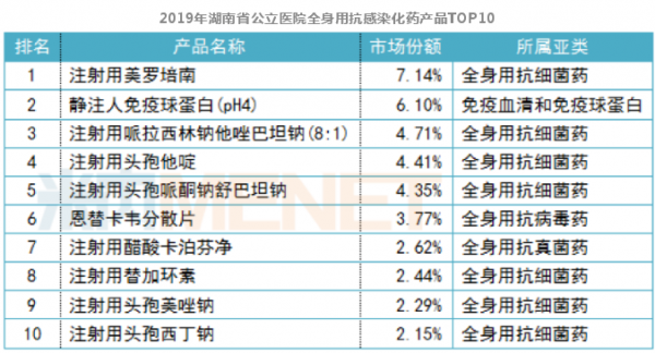 2019年湖南省公立医院全身用抗感染化药产品TOP10