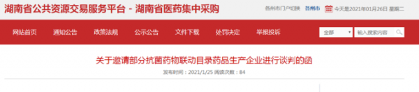 1月25日,湖南省公共资源交易中心发布挂出《关于邀请部分抗菌药物联动目录药品生产企业进行谈判的函》(下称“文件”),拟于1月28日对原参与抗菌药物投标未中标后纳入联动目录、且采购金额较多的药品进行议价谈判。涉及6个品种,其中5个为跨国企业产品。