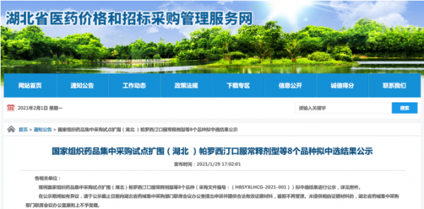 1月29日,湖北省药械集中采购部门发布的一则通知正助力着这种趋势的到来:湖北省医药价格和招标采购管理服务网公示了国家组织药品集中带量采购试点扩围(湖北)帕罗西汀口服常释剂型等8个品种拟中选结果。原中选企业大部分被替代映射出两个鲜明特点引起业界关注。