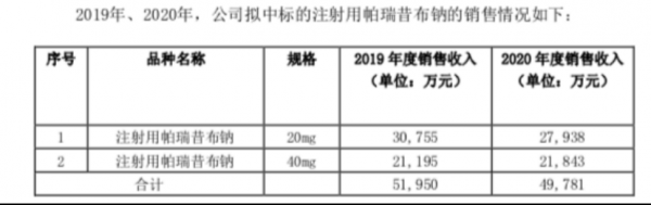 据上海阳光采购网公布的拟中选结果显示,帕瑞昔布注射剂共有10家企业拟中选,中标价为2-6元/瓶不等,峨眉山通惠制药报价最低,为2.98元。科伦为该品种国内首仿,于2020年11月才通过一致性评价,科伦40mg报价5.64元,以第9顺位压线中选,供应区域为湖南、宁夏、新疆(含兵团) 。据科伦公告显示,其拟中标的帕瑞昔布注射剂(20mg+40mg )2019年销售收入51950万元,2020年销售额为49781万元。