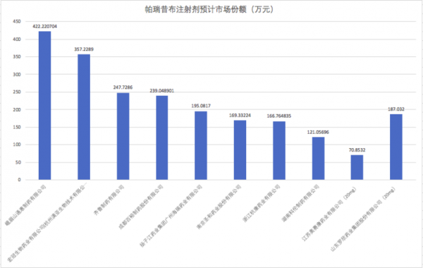 帕瑞昔布是一种选择性环氧化酶-2抑制剂,主要用于术后疼痛的治疗,是临床多模式镇痛的基础用药之一。注射用帕瑞昔布钠既可静脉注射,又可肌肉注射,可有效满足术后镇痛需快速起效和患者无法进食的临床需求,广泛用于普通外科、妇科、骨科、口腔科等多个科室术后疼痛的治疗。除原研药企辉瑞外,该药40mg品规过评企业中,齐鲁、罗欣、海正、苑东、奥赛康等知名药企均在其列。帕瑞昔布注射液2019年公立医院终端销售额为19.94亿元,同比增长54.7%。其中,辉瑞与科伦占据当前帕瑞昔布注射剂市场份额的主导地位,科伦药业该药销售额达5.19亿元,占比26%。