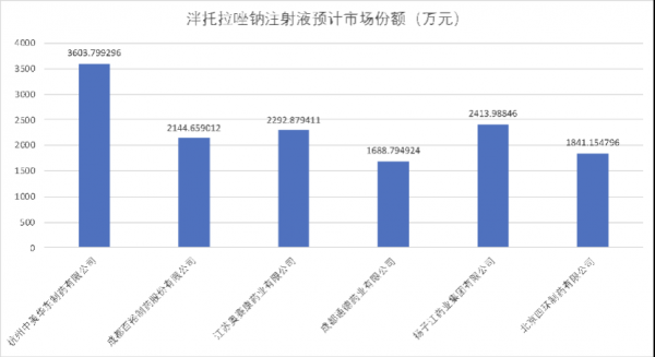 另外5家中标的企业所分到的市场份额较为平均,值得注意的是,四环制药以最高价4.94元/支中标,将分到1841.15万元的市场,而成都通德药业以第四顺位2.84元/支的价格中标,市场份额仅为1688.79万元。