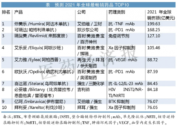 据全球知名医药市场调研机构Evaluate Pharma于2020年12月作出的预测,尽管修美乐/Humira(阿达木单抗)2021年仍旧霸占全球最畅销药品TOP10榜首位置,但可瑞达/Keytruda(帕博利珠单抗)销售额快速增长,将进一步缩短二者之间的差距。