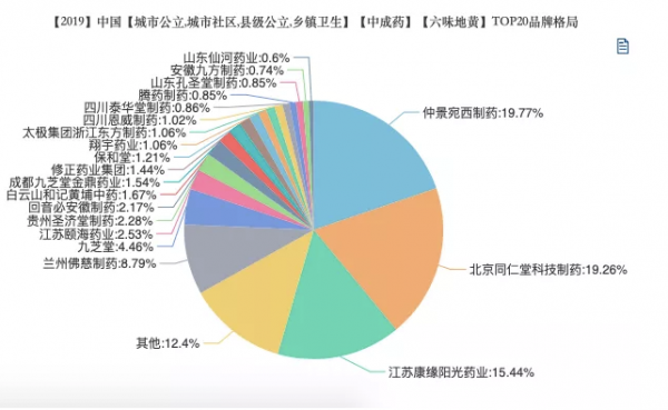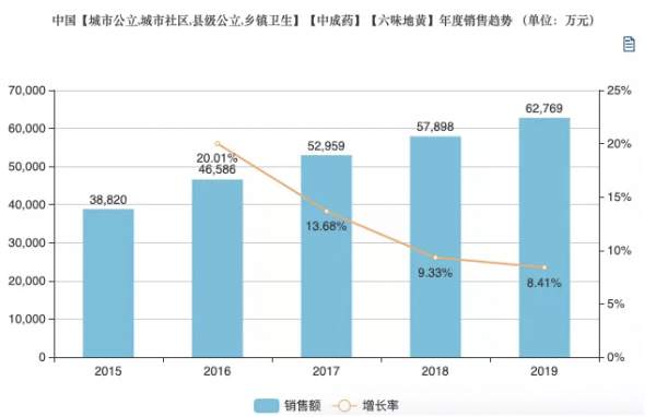市场方面,据米内网数据显示,2019年六味地黄制剂的销售额达到6.2亿,近年销售额度增长率虽然在下降,但是一直以年增长5千万元左右稳定增长中。企业竞争格局方面,其市场集中度相对较高,仲景宛西制药、北京同仁堂科技制药、江苏康缘阳光药业三家占据了超过一半的市场份额。