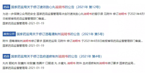 事实上,除六味地黄制剂以外,自2021年到现在,国家药监局已发布的15份说明书修订方面公告中有8份为中药相关,并涉及速效救心丸、血府逐瘀制剂等药物。