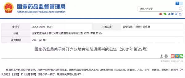 今日,国家药品监督管理局发布公告,分别对六味地黄制剂处方药和非处方药(包括丸剂、胶囊剂、片剂、合剂、煎膏剂、颗粒剂)说明书【不良反应】、【禁忌】和【注意事项】项进行统一修订。