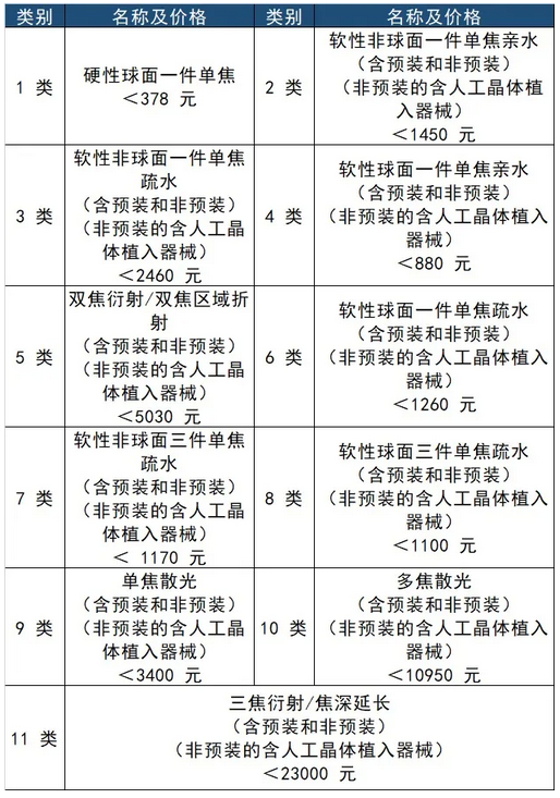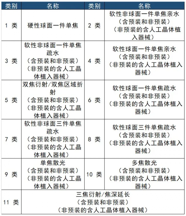 此前对于医用耗材第二轮国采的品种的猜测中,就有业内人士分析,国家或许会重点关注组套简单,分类清晰的品种,例如人工晶体类高值耗材。由于该类耗材基本单独存在,较少和其他器械形成组套销售,而且通过10种功能分类基本能够顺利将市场所有人工晶体分组。