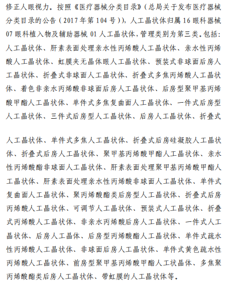 按照《医疗器械分类目录》(总局关于发布医疗器械 分类目录的公告(2017 年第 104 号)),人工晶状体归属 16 眼科器械 07 眼科植入物及辅助器械 01 人工晶状体,管理类别为第三类。