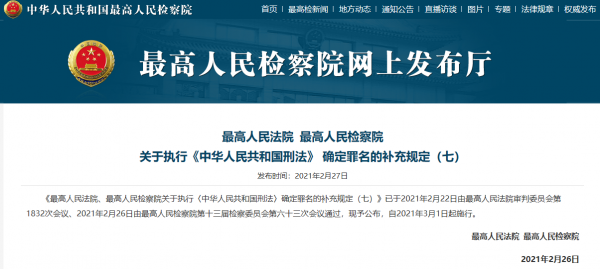 2月27日,最高人民检察院官网发布了“关于执行《中华人民共和国刑法》 确定罪名的补充规定(七)”(以下简称“补充规定”)。