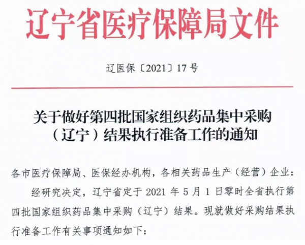 根据通知,辽宁省将于5月1日零时起,全省执行第四批国家集采辽宁地区中选结果。