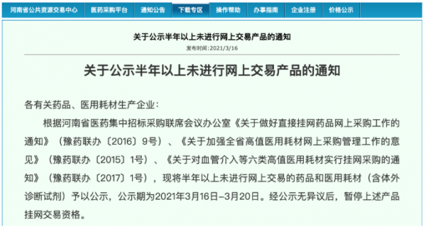 3月16日,河南发布《关于公示半年以上未进行网上交易产品的通知》。根据河南省医药集中招标采购联席会议办公室《关于做好直接挂网药品网上采购工作的通知》《关于加强全省高值医用耗材网上采购管理工作的意见》《关于对血管介入等六类高值医用耗材实行挂网采购的通知》,河南将半年以上未进行网上交易的药品和医用耗材(含体外诊断试剂)予以公示,公示期为2021年3月16日-3月20日。经公示无异议后,暂停上述产品挂网交易资格。