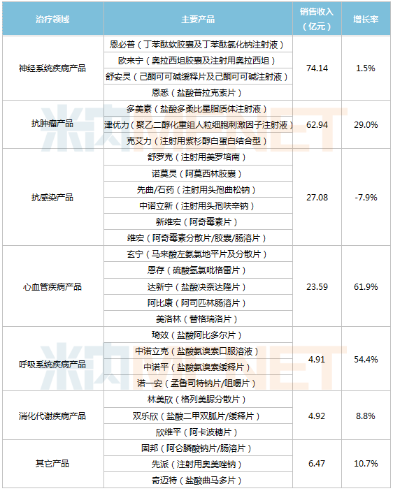 石药集团成药业务各治疗领域产品销售情况