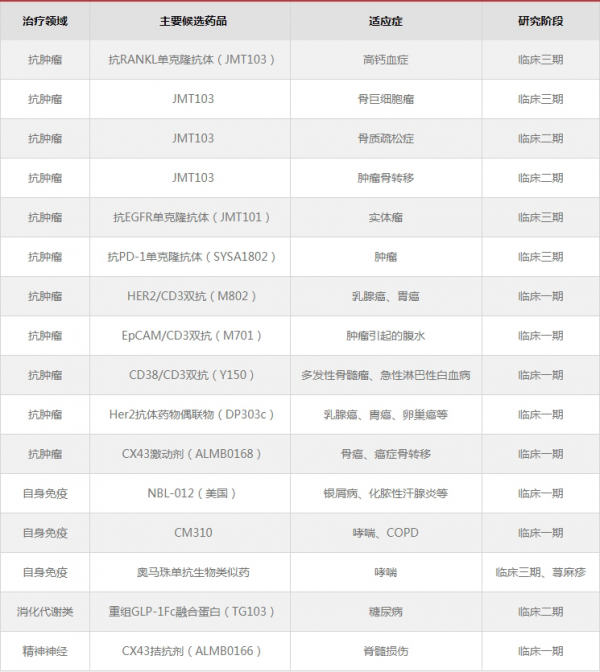 40余项在研大分子创新药中,16项处于临床研究阶段,其中5项注册临床,20余项处于临床前研究阶段。抗RANKL单克隆抗体(JMT103)、抗EGFR单克隆抗体(JMT101)、抗PD-1单克隆抗体(SYSA1802)、奥马珠单抗生物类似药等均处于III期临床研究阶段,JMT103预计将于2022-2023年上市。