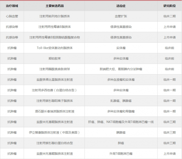 20余项在研新型制剂中,3项待批准生产,10项正在进行临床研究,10余项处于临床前研究阶段。其中,两性霉素B脂质体已提交上市申请,伊立替康脂质体将于近期提交上市申请。两性霉素B纳米复合物、米托蒽醌脂质体已报NDA并获得优先审评,预计今年获批上市。
