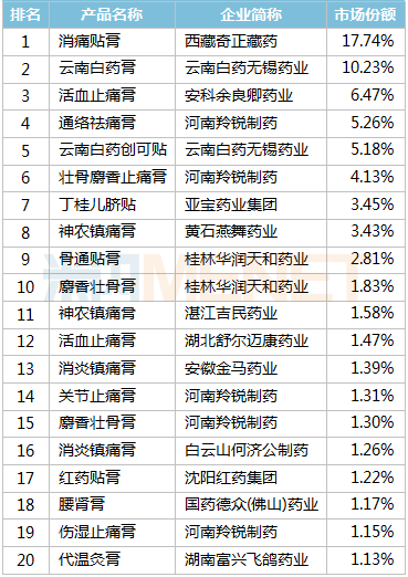 从品牌TOP20来看,西藏奇正藏药的消痛贴膏、云南白药无锡药业的云南白药膏、安科余良卿药业的活血止痛膏位居前三,河南羚锐制药的通络祛痛膏、壮骨麝香止痛膏、关节止痛膏等5个产品跻身品牌TOP20。
