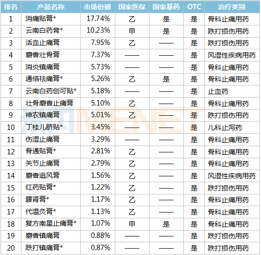 2020E重点城市实体药店中成药贴膏剂品牌TOP20