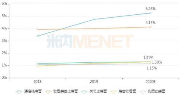 羚锐制药的通络祛痛膏、壮骨麝香止痛膏、关节止痛膏等5个产品均在品牌TOP20中。其中,通络祛痛膏是独家产品,功能主治活血通络,散寒除湿、消肿止痛,主要用于腰部、膝部骨性关节炎瘀血停滞等。米内网数据显示,近年在重点城市实体药店通络祛痛膏快速增长,2019年销售额突破1亿元大关,预计2020年再创新高。