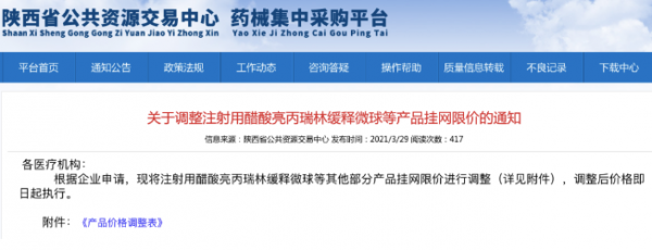 3月29日,陕西公共资源交易中心发布消息:将注射用醋酸亮丙瑞林缓释微球等其他部分产品挂网限价进行调整。
