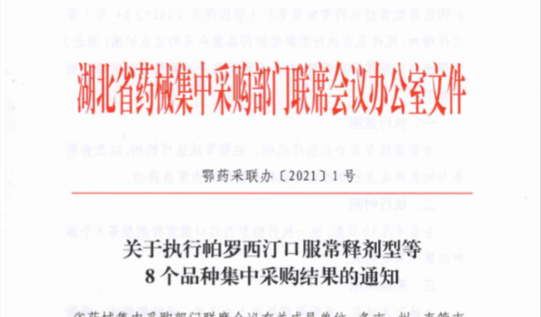 4月6日,湖北省医药价格和招标采购管理服务网发布《关于执行帕罗西汀口服常释剂型等8个品种集中采购结果的通知》,将湖北省执行国家组织药品集中采购试点扩围帕罗西汀口服常释剂型等8个品种的集中采购结果有关事项进行了通知。