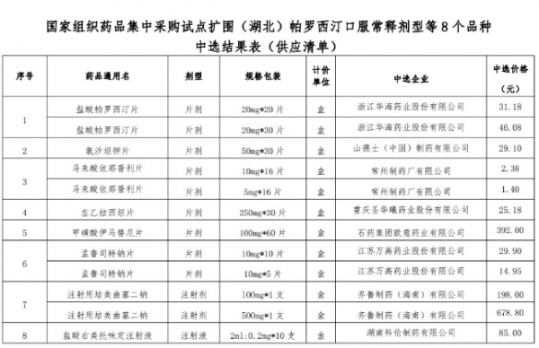 从上述对比可以看到,除了盐酸帕罗西汀片(20mg*20片)仍然由华海药业以31.18元的4+7扩围中选价格保持住了在湖北的中选资质外,其他7个品种的中选药企均有变化。
