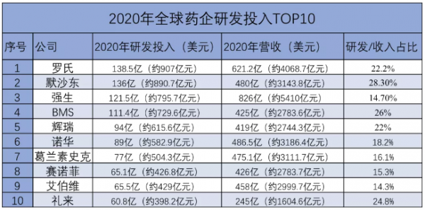 罗氏位于榜单第一,研发投入138.5亿美元,占总收入22.2%。相较2019年增加了13.85亿美元。2020年,罗氏销售额为621.2亿美元,同比增长1%,中国区销售额167.87亿元,增长幅度为16%。