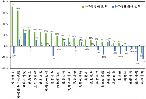 而实际上参与“4+7”带量采购试点的品种中,只有7个实现了销售额的正向增长,剩余的品种的销售额则都有不同程度的下降,其中还包括销量增速最大的吉非替尼。