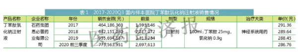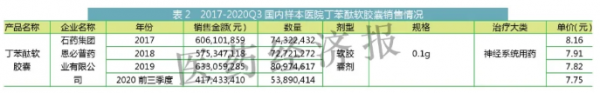 数据显示,2019年丁苯酞软胶囊在样本医院的销售额为6.330亿元(神经系统用药的放大倍数为2.68,则放大至全国公立医院购药金额为6.330×2.68,约为16.964亿元),2020年前三季度销售金额为4.174亿元,预计2020年全年销售金额将低于2019年。