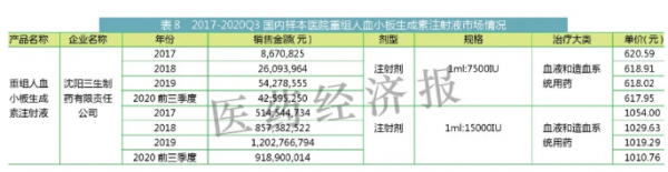 数据显示,2019年重组人血小板生成素注射液在样本医院的销售金额为12.570亿元(血液和造血系统用药的放大倍数为3.31,则放大至全国公立医院购药金额为12.570×3.31约为41.607亿元),2020年前三季度销售金额为9.615亿元,预计2020年全年销售金额会略高于2019年。