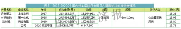 数据显示,2019年丹参酮ⅡA磺酸钠注射液在样本医院的销售额为2.417亿元(心血管系统用药的放大倍数为3.29,则放大至全国公立医院购药金额为2.417×3.29,约为7.952亿元),2020年前三季度销售金额为0.998亿元,预计2020年全年销售额将大幅低于2019年。