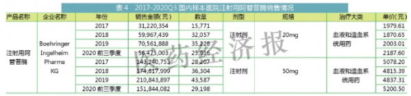 注射用阿替普酶的销售数量总体是上升的,单价也略有上升。2019版医保目录调整时,价格反而有所上升:20mg规格平均价格提高了180多元,为2187.6元;50mg规格提高了160多元,为5200元左右。而此次医保谈判后,价格有较大幅度下降,可以预测,2021年该药销售数量还会明显上升,但销售金额将有所降低。