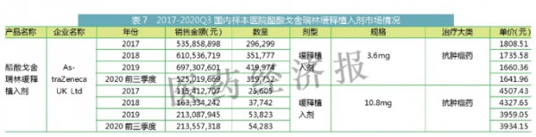 数据显示,2019年醋酸戈舍瑞林缓释植入剂在样本医院的销售额为9.104亿元(抗肿瘤药的放大倍数为1.96,则放大至全国公立医院购药金额为9.104×1.96,约为17.844亿元),2020年前三季度销售额为7.386亿元,预计2020年全年会高于2019年的销售额。