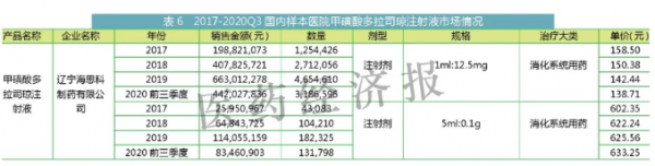 数据显示,2019年甲磺酸多拉司琼注射液在样本医院的销售额为7.771亿元(消化系统用药的放大倍数为3.13,则放大至全国公立医院购药金额为7.771×3.13,约为24.323亿元),2020年前三季度销售金额为5.255亿元,预计2020年全年销售额略低于2019年。