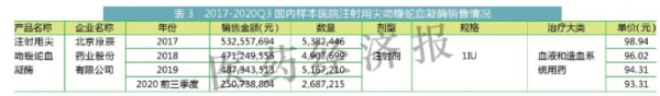 数据显示,2019年注射用尖吻蝮蛇血凝酶在样本医院的销售额为4.873亿元(血液和造血系统用药的放大倍数为3.31,则放大至全国公立医院购药金额为4.873×3.31,约为16.130亿元),2020年前三季度销售金额为2.507亿元。预计2020年全年销售额将大幅低于2019年。