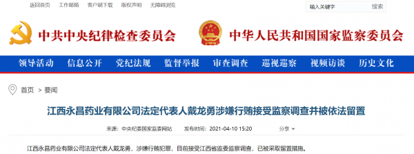 4月10日,中纪委国家监委网站讯,江西永昌药业有限公司法定代表人戴龙勇,涉嫌行贿犯罪,目前接受江西省监委监察调查,已被采取留置措施。