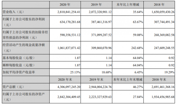 2020年,万孚生物营业收入为2810841254.41元,同比增长35.64%;净利润达634170281.68元,同比增长了63.67.
