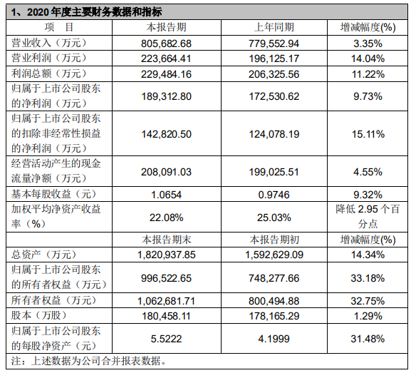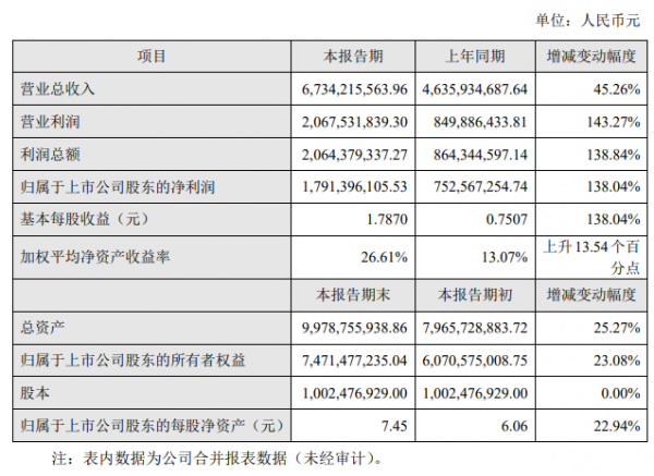 报告期内,公司实现营业收入 805682.68万元,较上年同期增长 3.35%;营业利润223664.41万元,较上年同期增长14.04%;利润总额 229484.16 万元,较上年同期增长11.22%。