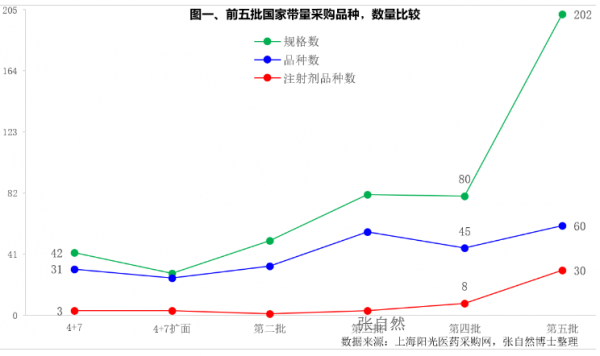 本批共60个品种、202个规格、30个注射剂,都是历次国家带量采购以来最多的。
