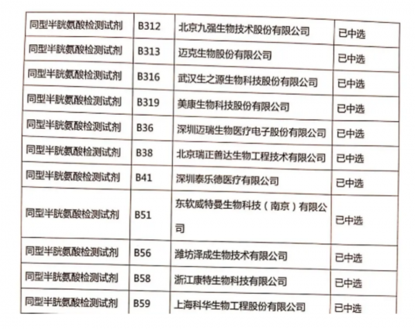 我们看到,新乡八市医用耗材联盟集中采购中,同型半胱氨酸检测试剂共有18家企业入选,其中九强生物、迈克生物、深圳迈瑞属于市场中的佼佼者。