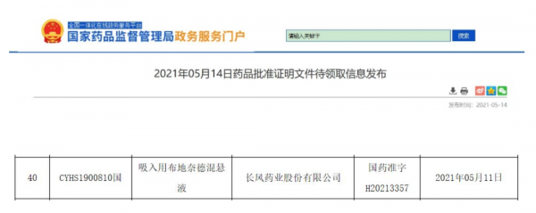 5月14日,国药药品监督管理局政府服务门户发布最新一批药品证明文件待领取信息,其中长风药业股份有限公司的吸入用布地奈德混悬液正式获得药品批准文号,意味着该公司成为了该品种第3家仿制药上市企业。