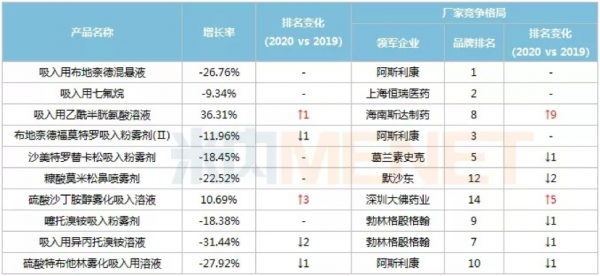 虽然跨国企业在中国公立医疗机构终端吸入剂市场仍占主导地位,但面对激烈的市场竞争,2020年阿斯利康的吸入用布地奈德混悬液、勃林格殷格翰的吸入用异丙托溴铵溶液、葛兰素史克的沙美特罗替卡松吸入粉雾剂销售额同比均出现了不同程度的下滑。