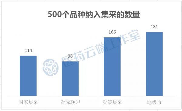据医药云端工作室不完全统计,目前500个品种中,纳入省际联盟的有98个,纳入各省级集采的166个,纳入各地市的有181个。