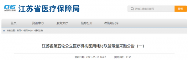 5月18日,江苏省医保局最新发布了一则《江苏省第五轮公立医疗机构医用耗材联盟带量采购公告(一)》(以下简称《公告》)。