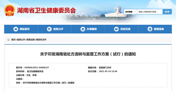 5月24日,湖南省卫健委联合湖南省中医药管理局、湖南省药品监督管理局发布《关于印发湖南省处方流转与监管工作方案(试行)的通知》(下称《试行方案》),提出建立全省统一的处方流转与监管平台,实现各医疗机构处方数据流转,开展医院处方外延、智能线上审方、慢性病续方、合理用药监测等工作。