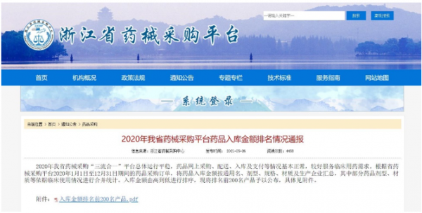 《通报》内容显示,2020年浙江省药械采购“三流合一”平台总体运行平稳,药品网上采购、配送、入库及支付等情况基本正常,较好服务临床用药需求,此次按照入库金额由高到低进行排序,根据的主要是药械采购平台2020年1月1日至12月31日期间的药品采购订单数据。