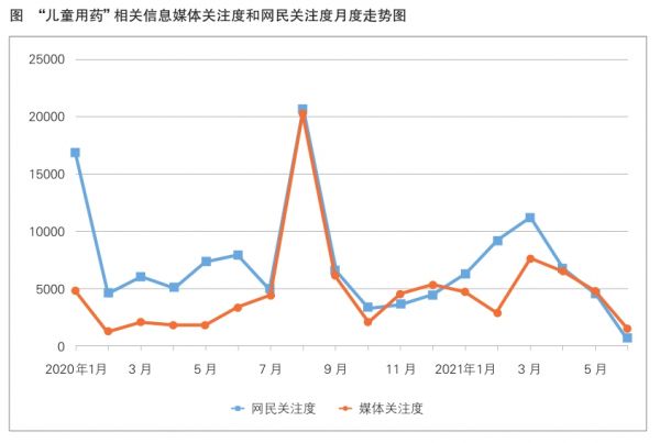 以2020年1月1日—2021年6月3日为监测时间段,“儿童用药”相关信息媒体关注度和网民关注度均在2020年8月达到顶峰(见图)。
