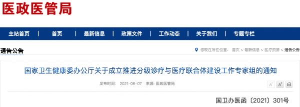 6月7日,国家卫生健康委发布关于成立推进分级诊疗与医疗联合体建设工作专家组的通知,对全国分级诊疗和医联体建设情况开展评估和督促落实等工作。