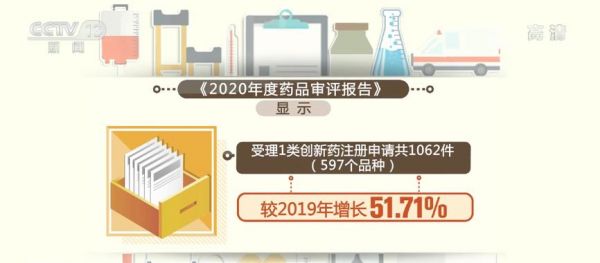 《报告》显示,全年有59件新冠病毒疫苗和新冠肺炎治疗药物的注册申请被纳入特别审批程序并完成技术审评。受理1类创新药注册申请共1062件(597个品种),较2019年增长51.71%。审评通过新药上市申请208件,较2019年增长26.83%。审评通过创新药上市申请20个品种(1类化学药14个、中药创新药4个、创新生物制品2个)。审评通过境外生产原研药品新药上市申请72个品种(含新增适应症品种)。